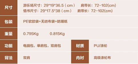 29*19*36.5cm 肩带:72-102cm 材质PU/涤纶 五金:8号铜牙拉链。