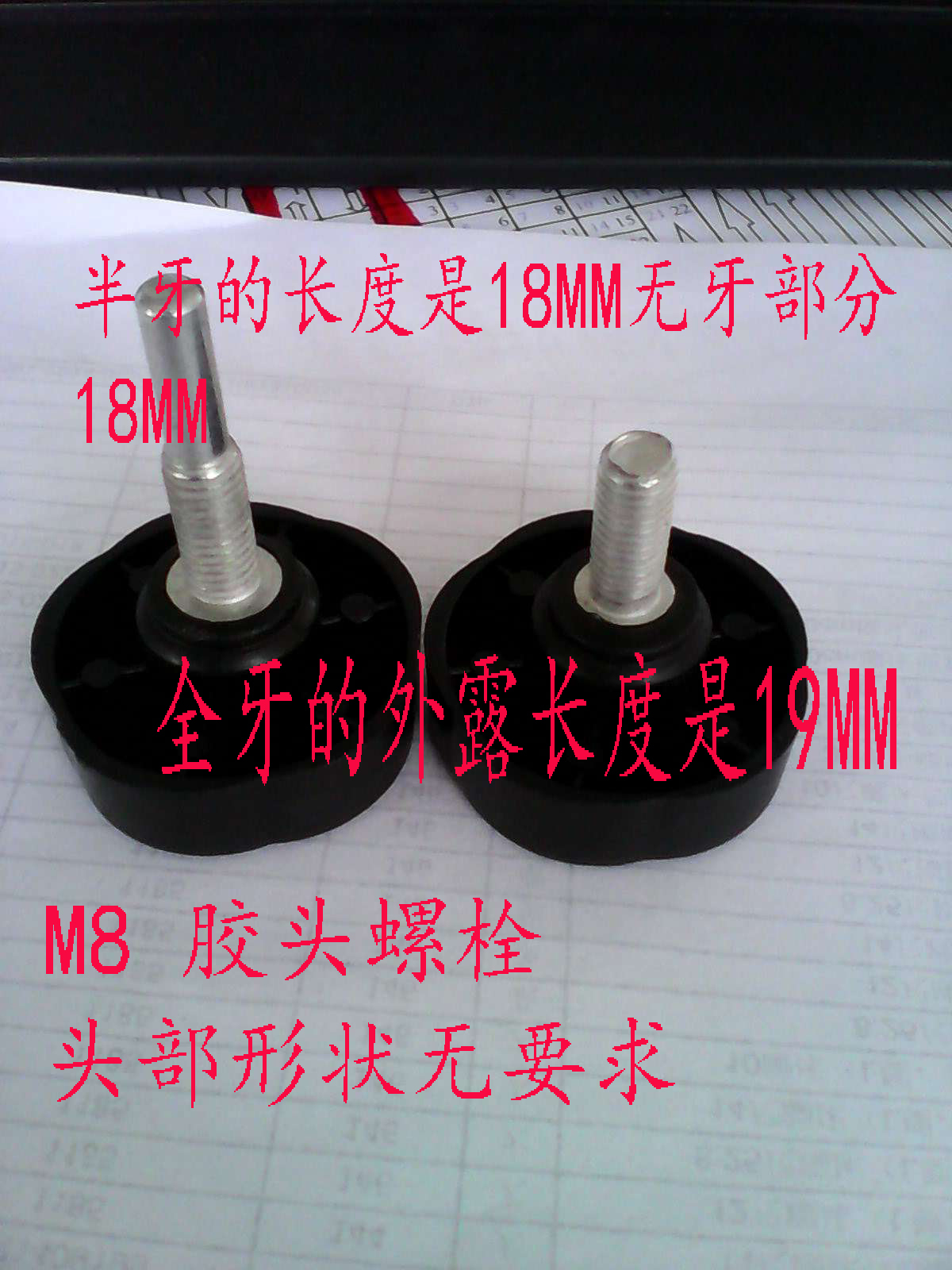 我公司需要采购胶头螺栓400个,M8,胶头形状材质不限。具体要求详见样图,报价请报含税含运费价格。