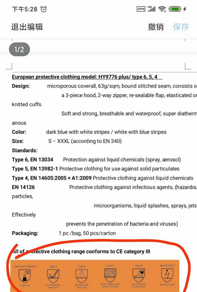 Type 6, EN 13034 Protection against liquid chemicals (spray, aerosol)