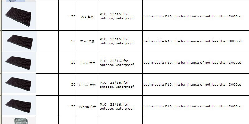 我公司需要P10 LED 模组450块,P10,32*12,防水,详见产品样图,请报 ,欢迎报价!