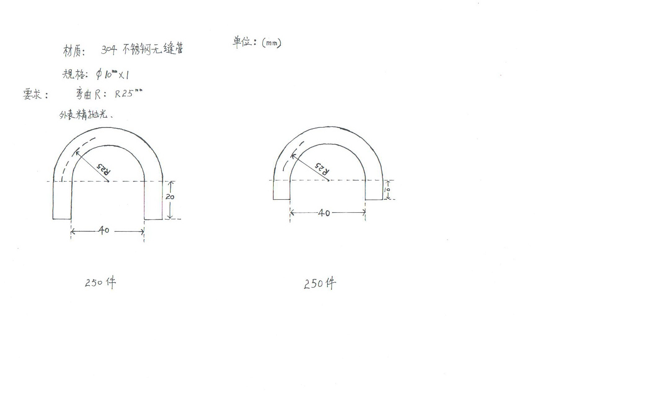 我公司因生产需要,现需要采购不锈钢管件,要求:10*1的304无缝不锈钢管外抛光,弯管。详细参数见图。这个规格是每月需要的。能加工的厂家请联系。请报含税价。