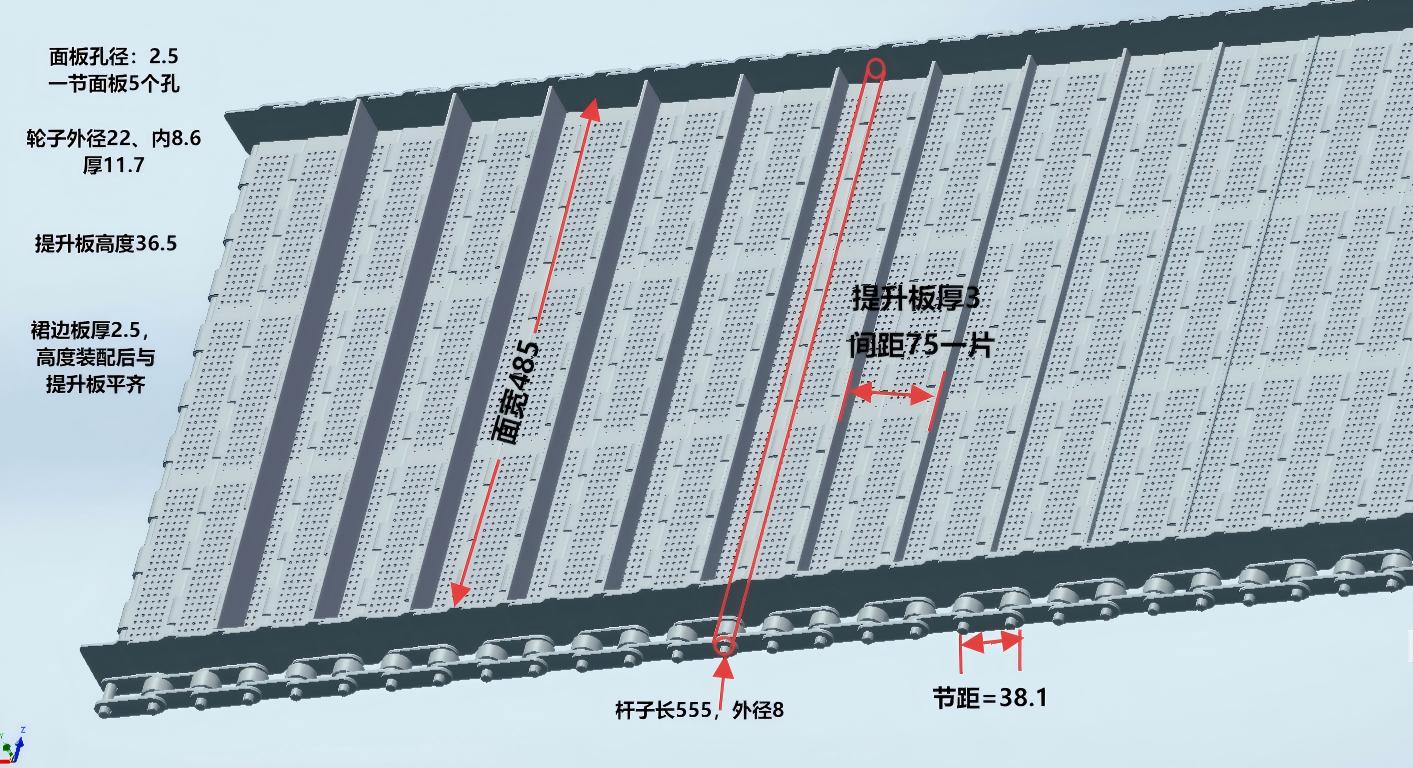 节距38.1,网板宽度485,网板厚度2-3,冲孔直径2-2.5,带裙边,裙边厚度2.5,带提升板间距75一片,提升板厚3,轮杆长555,轮杆直径8。所有部件材质304 我需要进一步了解:产品规格、型号、价格条款、是否可以定制