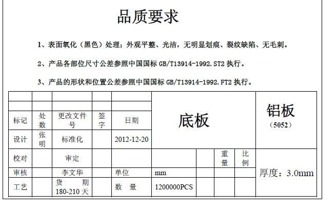 1,200,000 | 行应用业:冲压材料 求购底板(冲压件),订单量:120万个,材料5052(铝板),价格:工厂根据订单要求及市场行情结合本企业生产、管理条件自报合理价并报样,订单货期:180-210天,派员(QC)跟单控制品质及加工进度,每30-45天交一次货,出货地:工厂所在地就近中国外运港口,合作关系确立后可预付总价款的(20%-30%定金给工厂,先款后货,生产厂地验收、现汇结算、余款出货前付清。有合作意向的工厂需了解主要规格、型号及技术参数供报价参考,请致电联系或直接来我司面谈. |