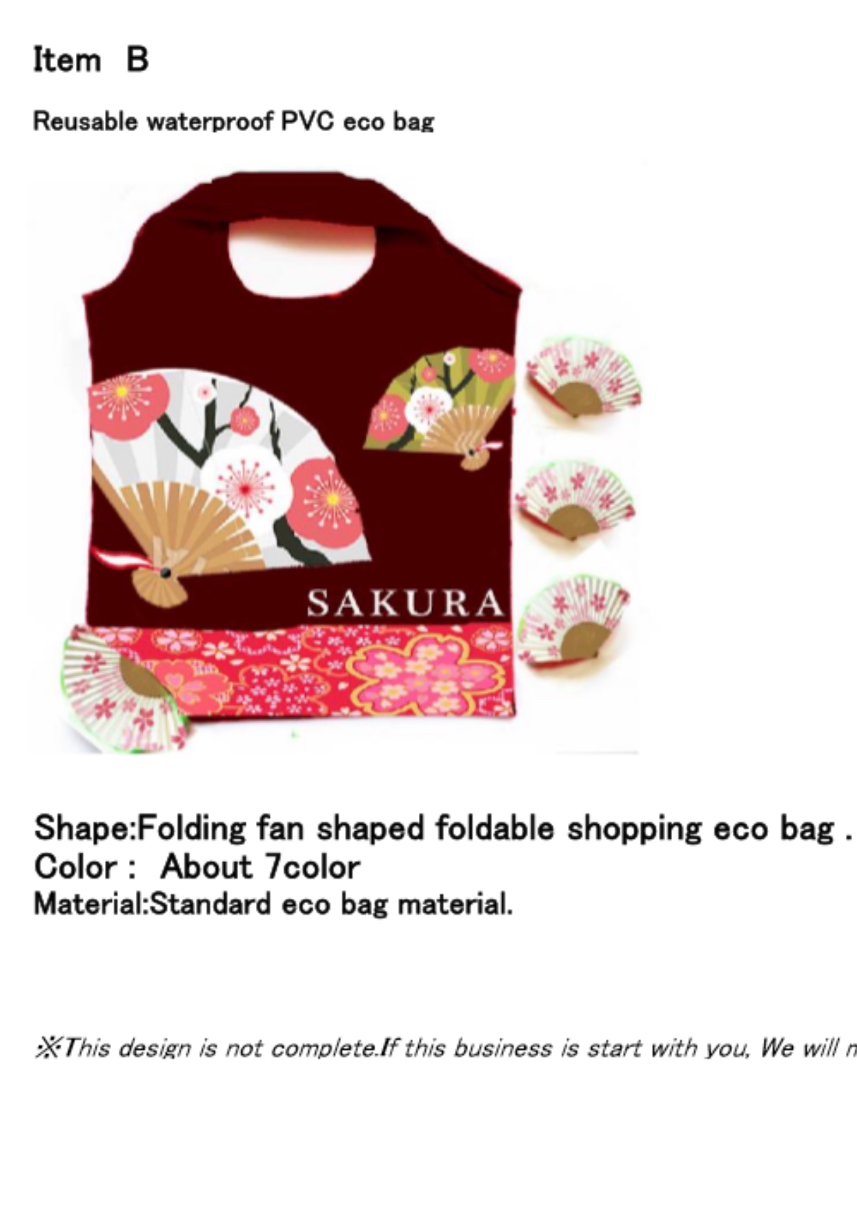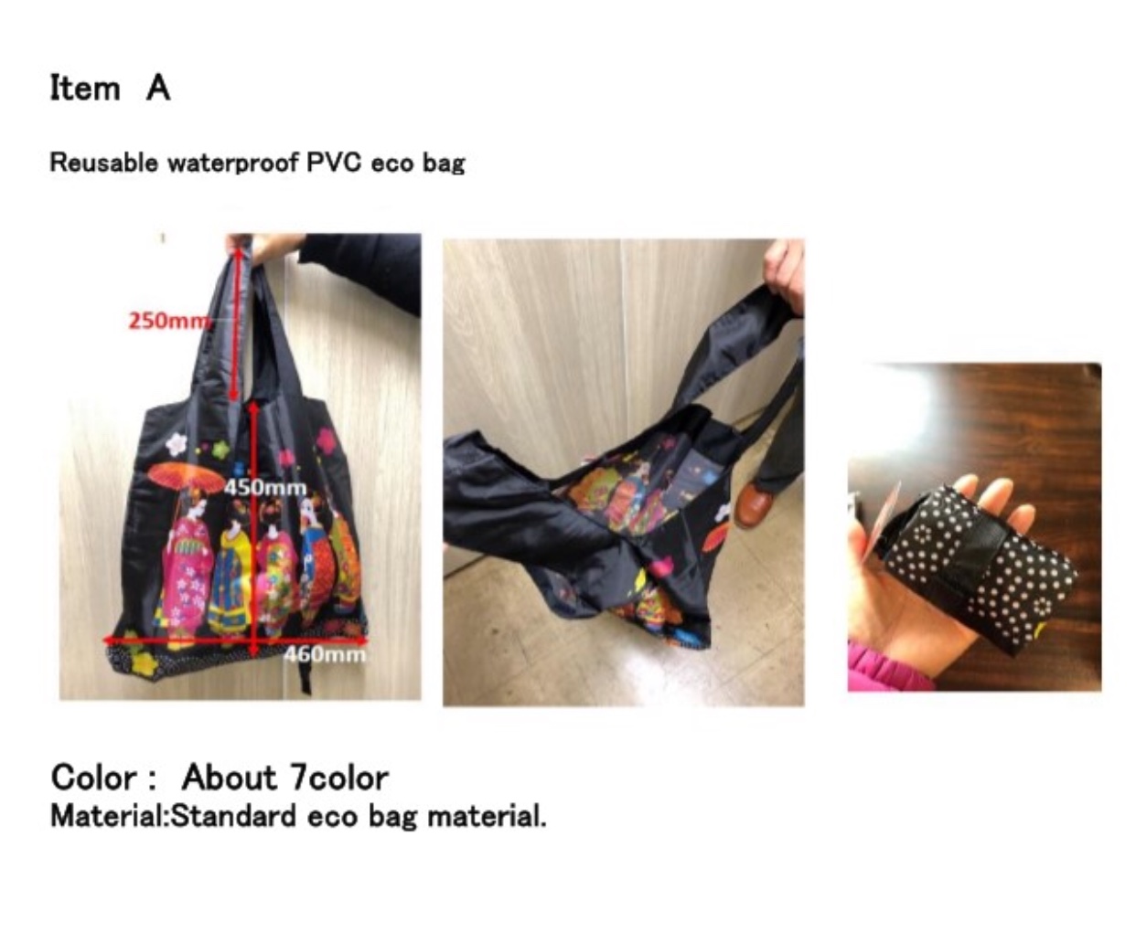 | 补充说明 | 该批货物出口日本,有做过日本单的公司或者有意做日本单的公司麻烦联系我,谢谢! Item A尺寸为图片尺寸45*46cm,手提25cm,手提为单层或双层;Item B尺寸为常规尺寸38*58cm(含手提),手提为单层,材料都是涤纶,每款各6000个 |