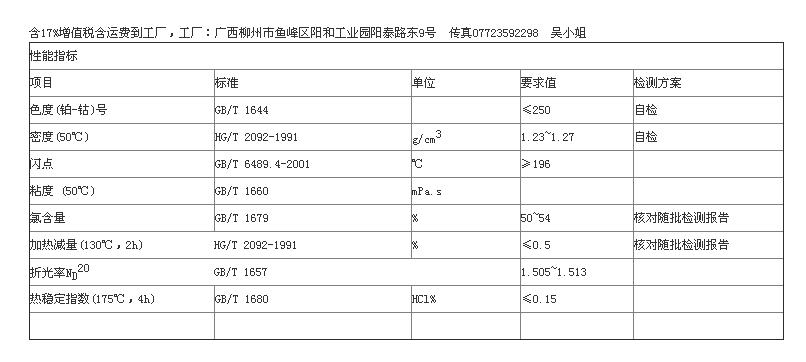 采购52#氯化石蜡,具体要求如下:1、氯含量:50--54% 2、加热减量:小于等于0.5% 3、直链正构烷烃;淡黄色粘稠液体,达到国标合格品要求,详细性能指标见图片;要求含17% 税含运费到工厂。工厂地址:广西柳州市鱼峰区阳和工业园阳泰路东9号。欢迎各供应商报价!