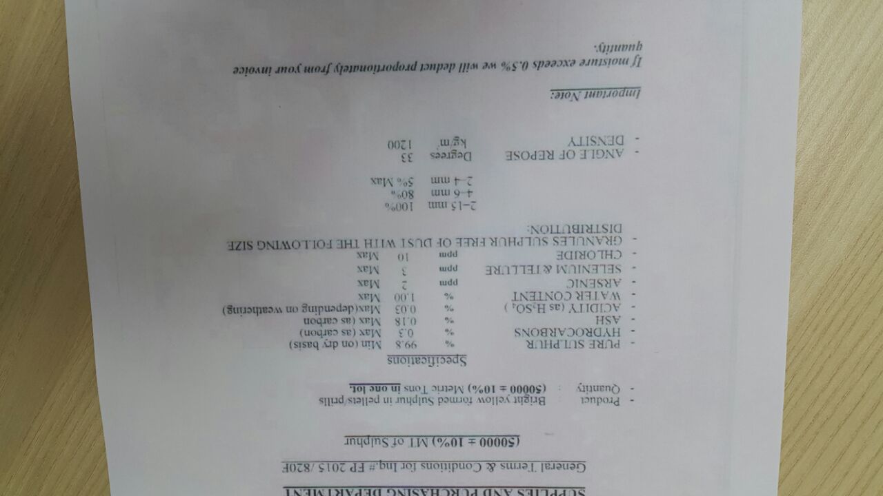 20,000MT | 纯度: 99.8%以上(以干基计算 碳氢化合物:0.3%以下(如碳) 灰烬:0.18%以下(如碳) 酸度(如 H2S04 ):0.03%(取决于风化形式) 含水量:1%以下 :百万分之二以下 硒&碲:百万分之三以下 氯化物:百万分之十以下 无粉尘颗粒 粒径分布如下 2~15mm 4~6mm 80% 2~4cm 5%以下 休止角: 33度 密度: 1200kg/㎡ 重要备注:如果湿度超过0.5%我们将从你们的 金额扣除相应的比例 |