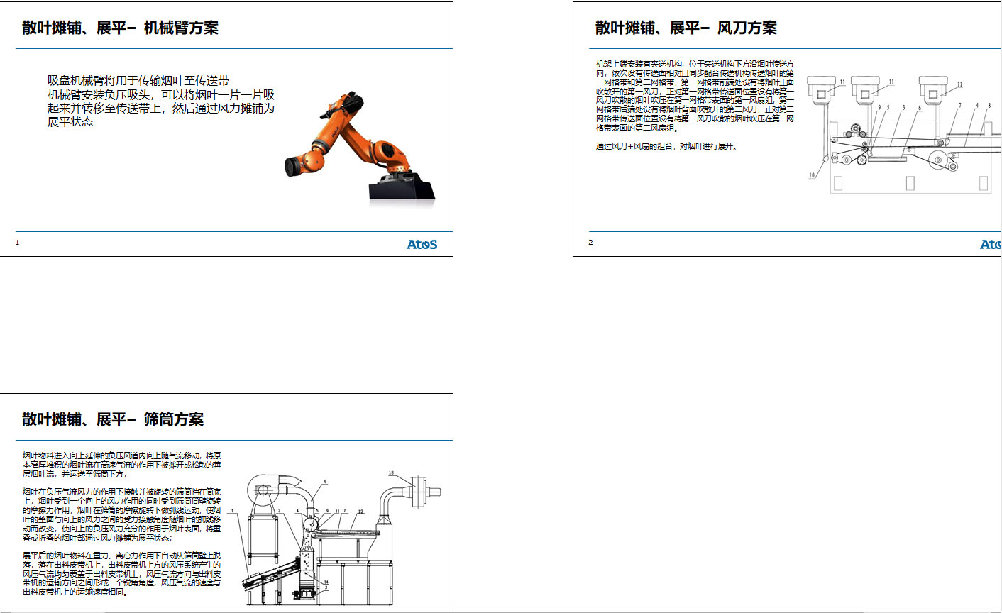 我需要生产制造的烟叶摊铺、展平的自动化机械设备,我有几个方案见附件,需要找现成的机械或者稍微改装就行的机械,可以是别的方案,只要能起到烟叶摊铺、展平的效果即可。