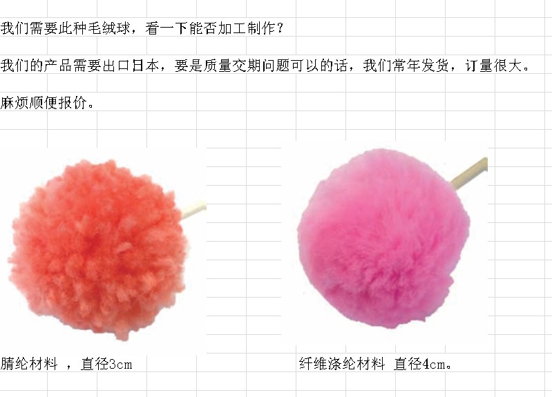 我需要毛绒球,规格如图所示。腈纶面料,直径3cm的毛绒球;和纤维涤纶材料,直径4cm的毛绒球。采购量大,长期订货,出口日本。要求供应商为厂家,报 ,欢迎报价!